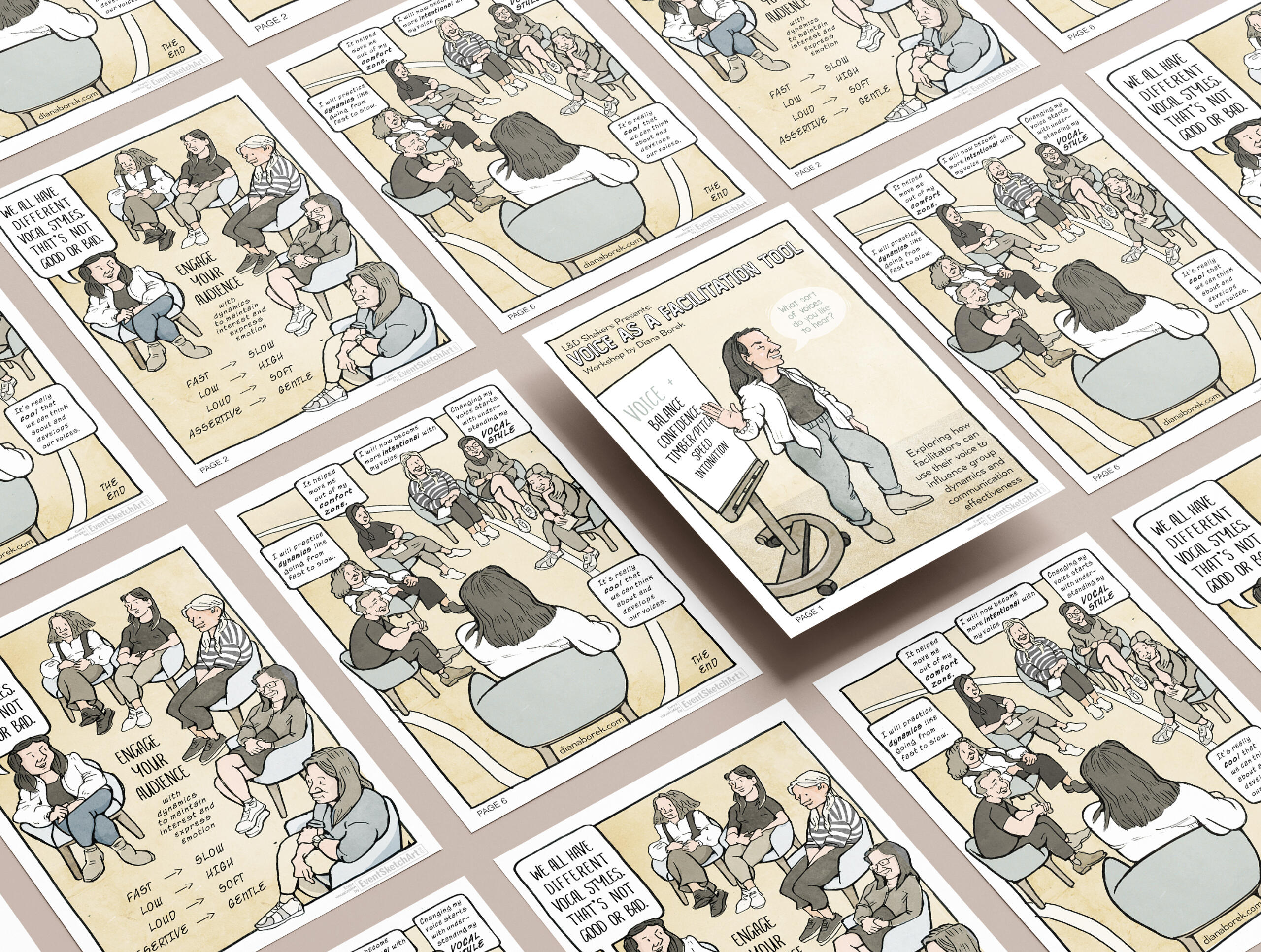Attend your event for visual note taking → Create caricatures & layouts, highlighting key moments and ideas → Produce multi-panel PDF → Deliver socially ready content