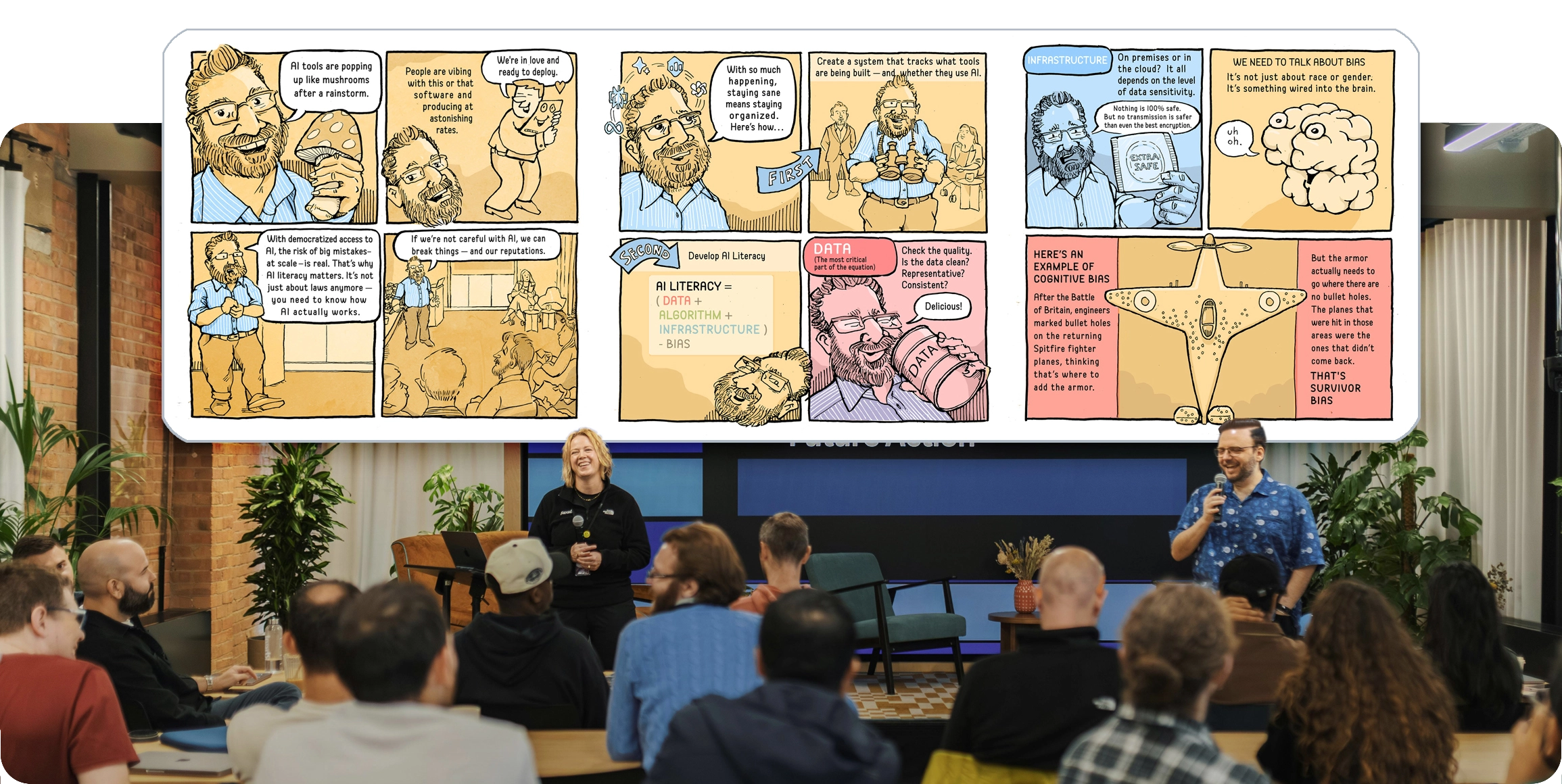 We show up at your conference, workshop, lecture, panel discussion — you name it. We then create graphic-novel-style visual narratives that highlight key moments in engaging, shareable formats. We transform one-time events into timeless stories that wow and inform audiences.